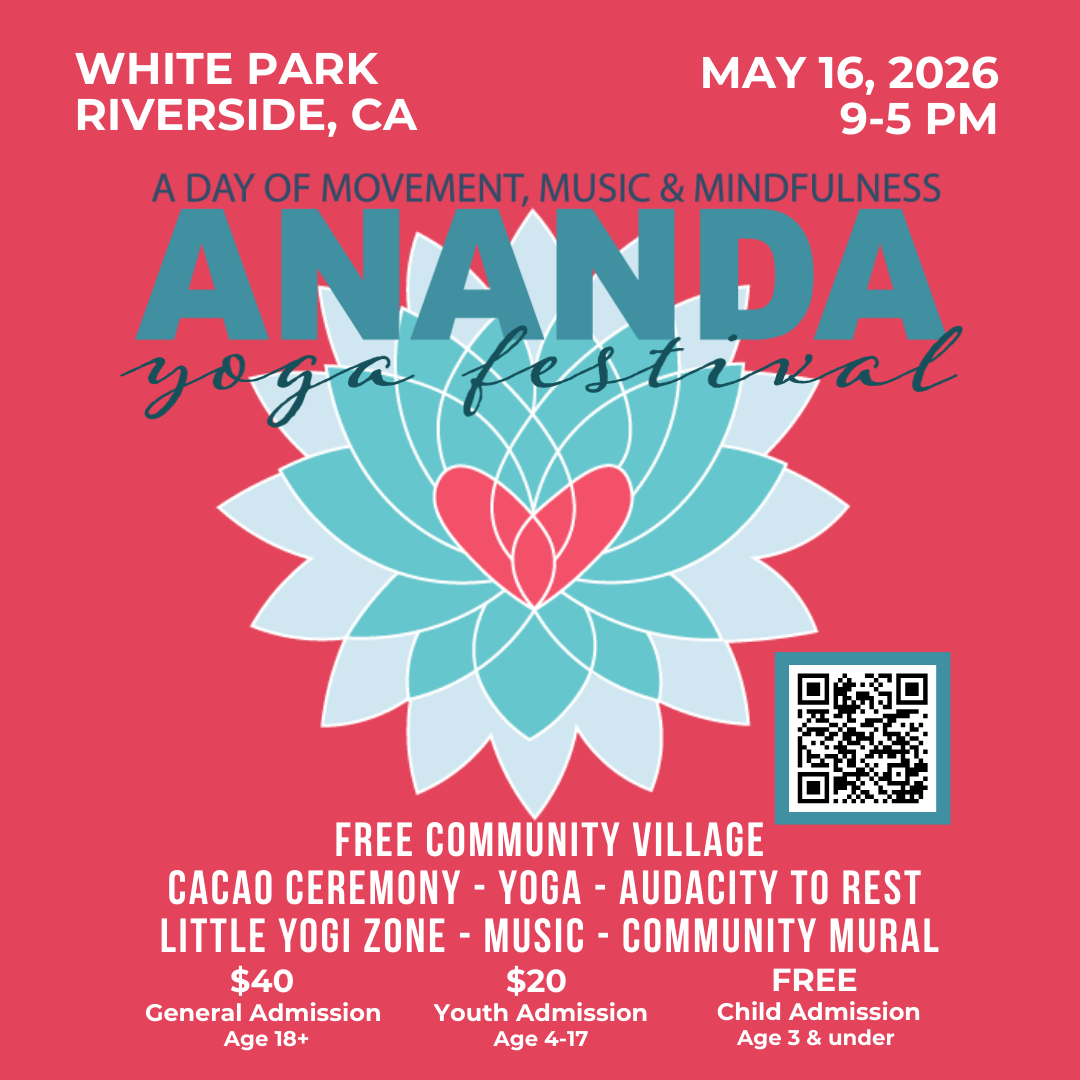 Ananda Yoga Festival returns to Riverside, California for a joy-filled day of movement, music, and mindfulness the whole family can enjoy. Join us Saturday, May 16, from 9:00am to 5:00pm as White Park comes alive with creativity, connection, and commUNITY. Immerse yourself in inspiring yoga offerings, enjoy live music, and connect with others in a vibrant atmosphere. Breathe deeply, move freely, and experience the uplifting power of yoga.